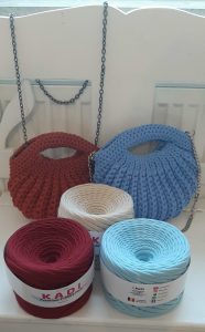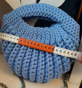 Die Tasche ist von Hand gehäkelt aus Baumwollgarn.